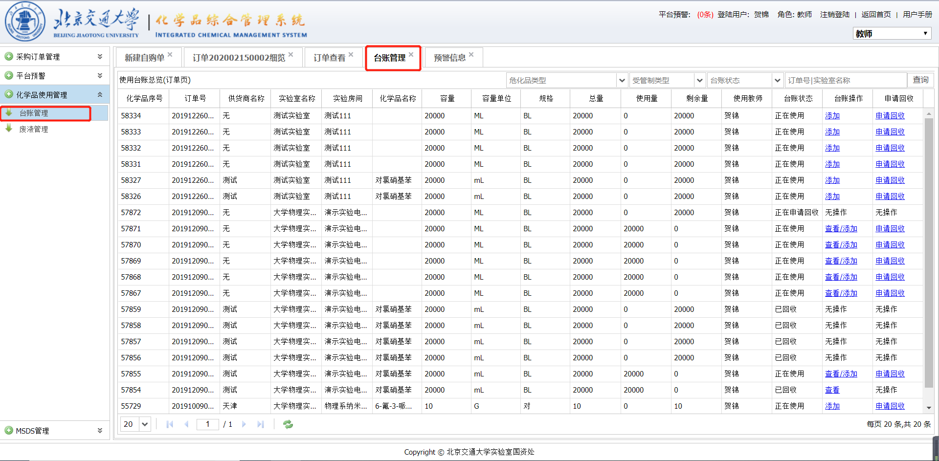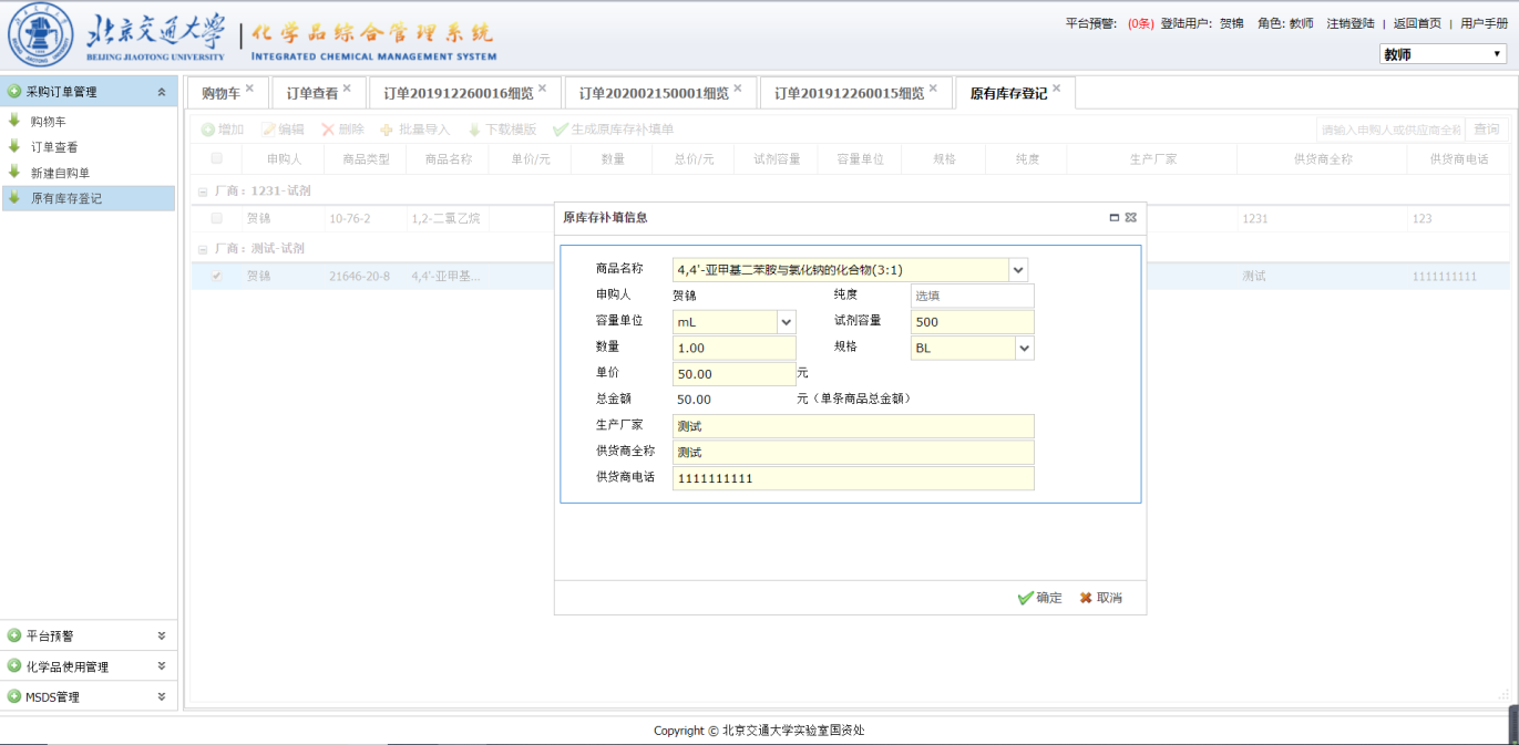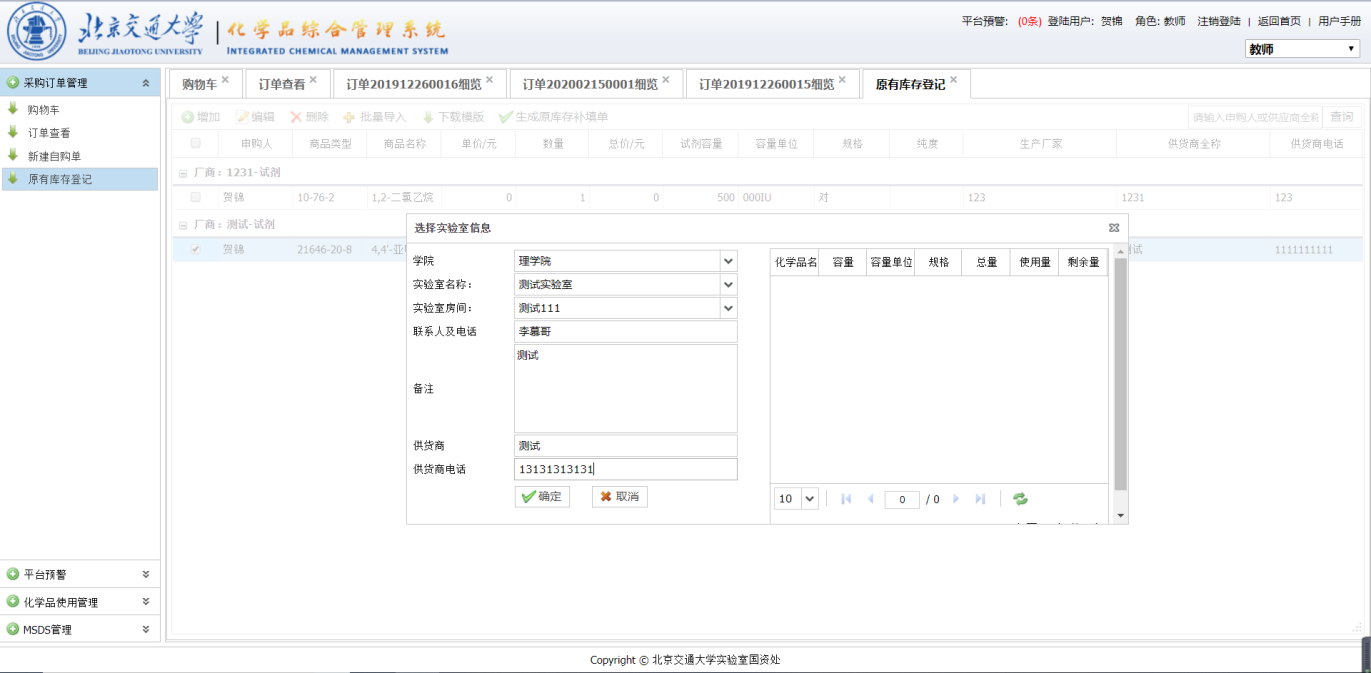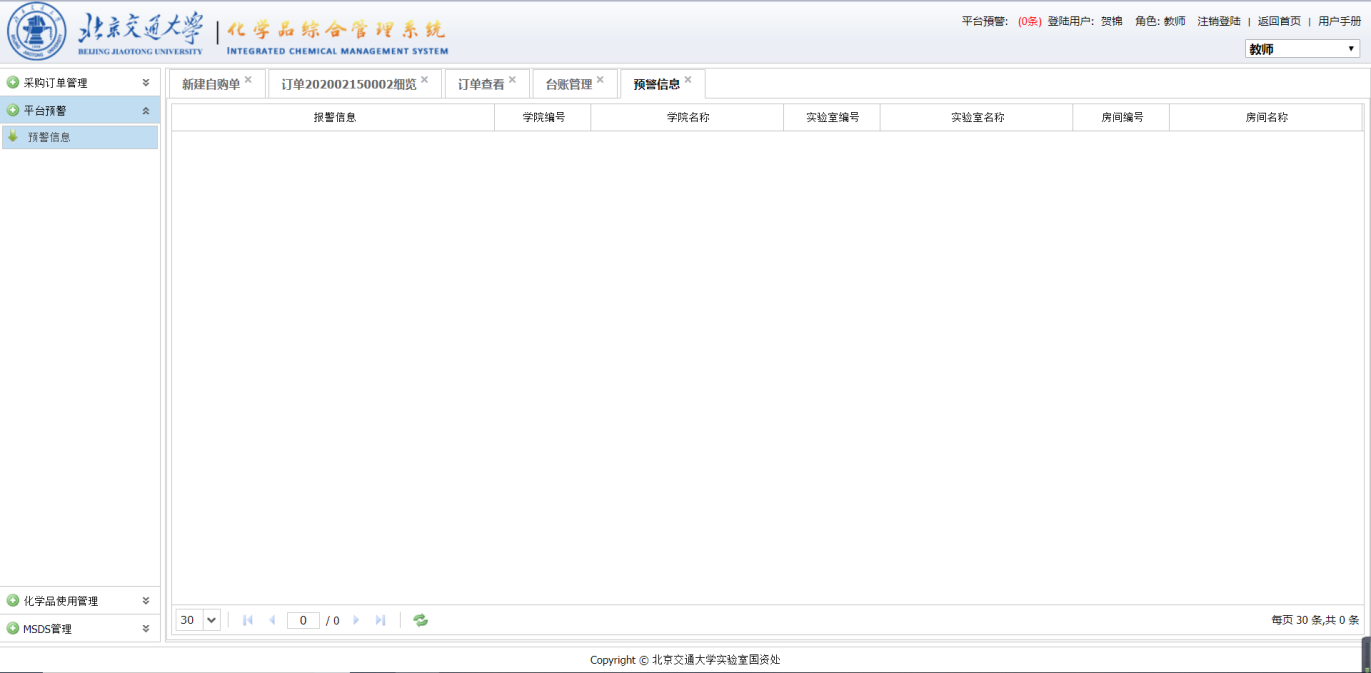 当教师购买的化学用品会产生危险反应时,平台会对针对这种情况发出预警信息,预警规则由管理员设置。