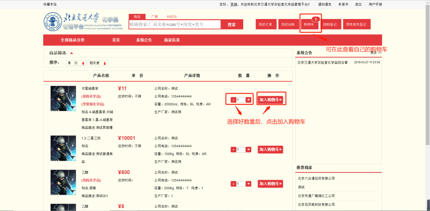 选择要购买的化学品的数量,然后点击【加入购物车】的按钮,即可将所选商品加入到购物车之中。在右上角点击【购物车】进入购物车页面