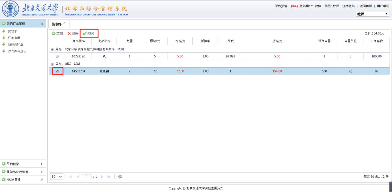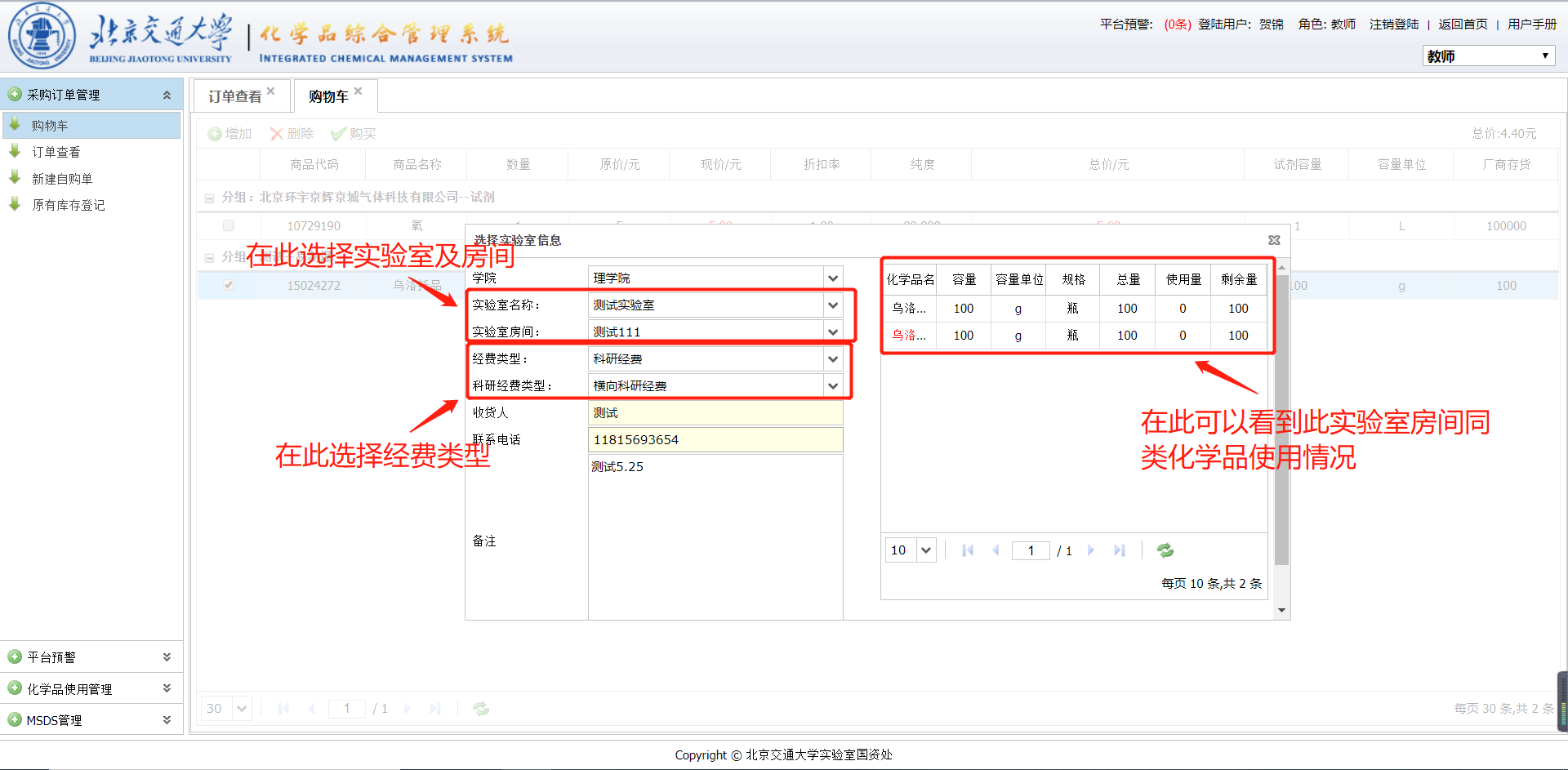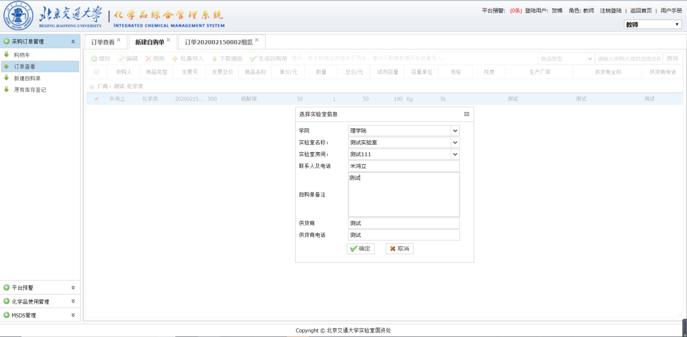 勾选要买的化学品,点击购买创建订单(同一订单的化学品管制类型必须相同,且是同一家厂商的商品),生成订单需要选择实验室,实验室房间;经费类型,填写收货人、收货人电话、备注等信息,提交后生成订单。