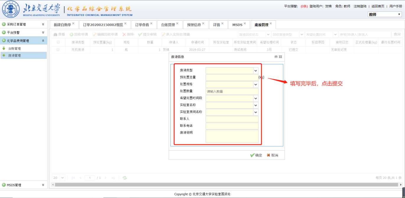 点击【回收申请】按钮,出现的对话框如下图所示。如果想要修改已经申请的废液管理点击【编辑回收申请】按钮,编辑完成后点击【确定】按钮