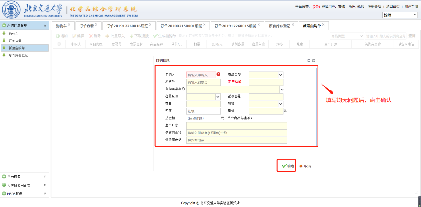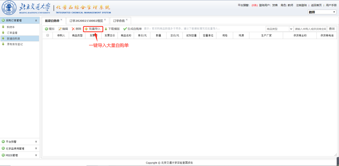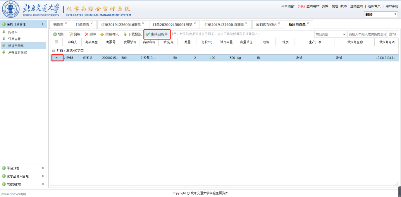 点击【批量导入】按钮选择填好的EXCEL文件,导入后的自动保存为草稿,需要同手动添加自购单一样勾选并点击【生成自购单】生成正式自购单,并填写实验室房间信息和供货商信息进入审批。