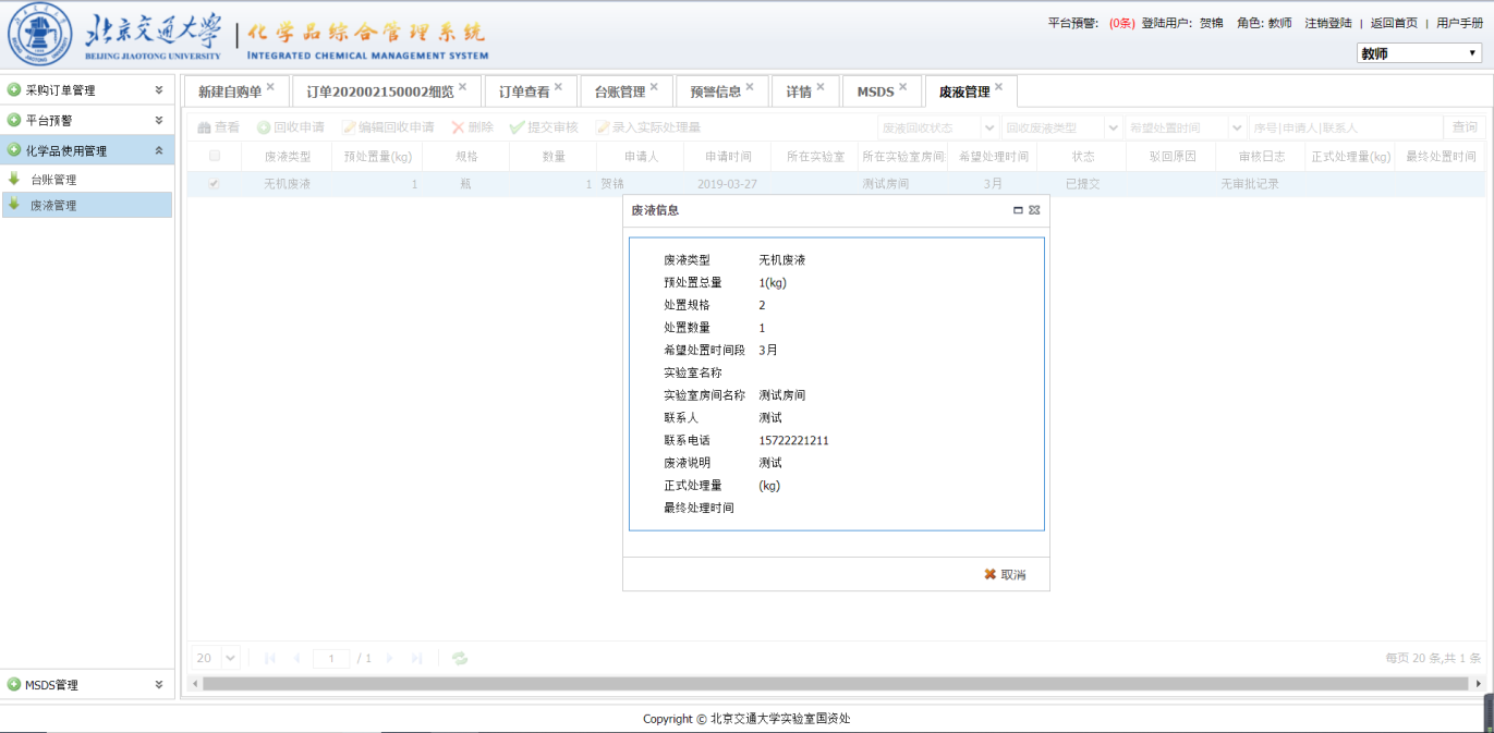 如果需要对废液删除或者查看选中并点击【删除】或者【查看】即可,点击【删除】会弹出确认信息,确认即可。点击【查看】会出现下图