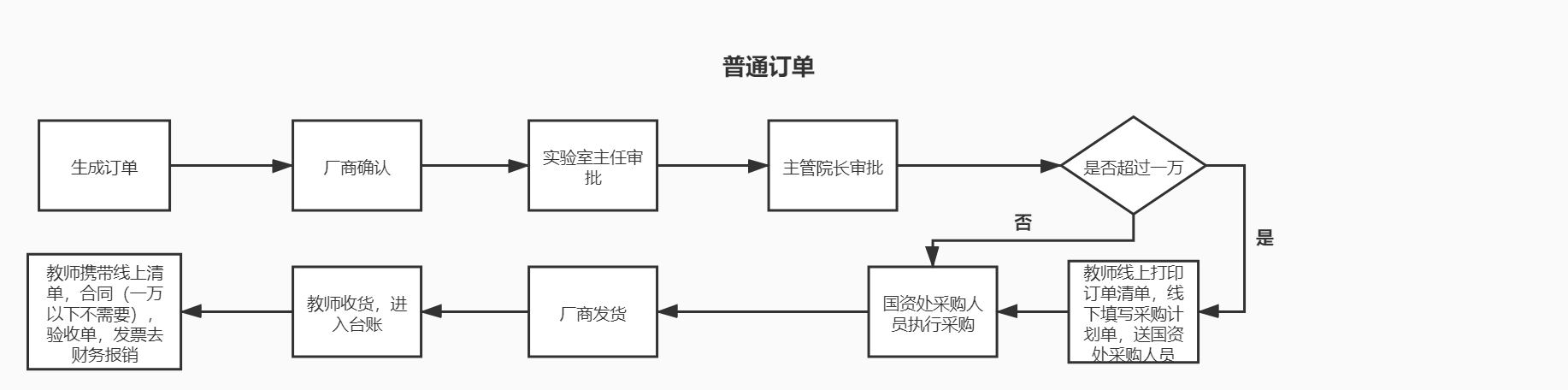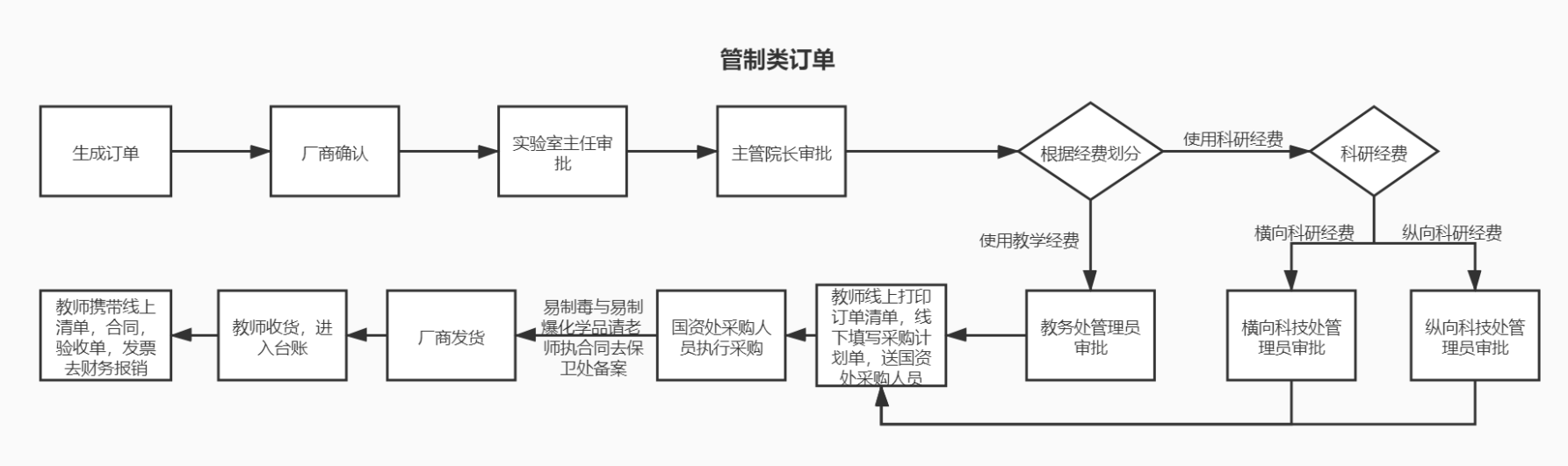 填写实验室房间信息,供货商信息后生成正式订单进入审批,依次经过学院管理员,所选用途管理员、实验室与设备管理处管理员审核,通过后教师确认收货后进入台账