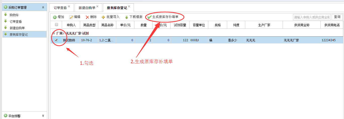 流程和自购一样,需要注意的是,导入的信息只是保存成草稿,还需要点击【生成原库存补填单】才能成为正式订单。