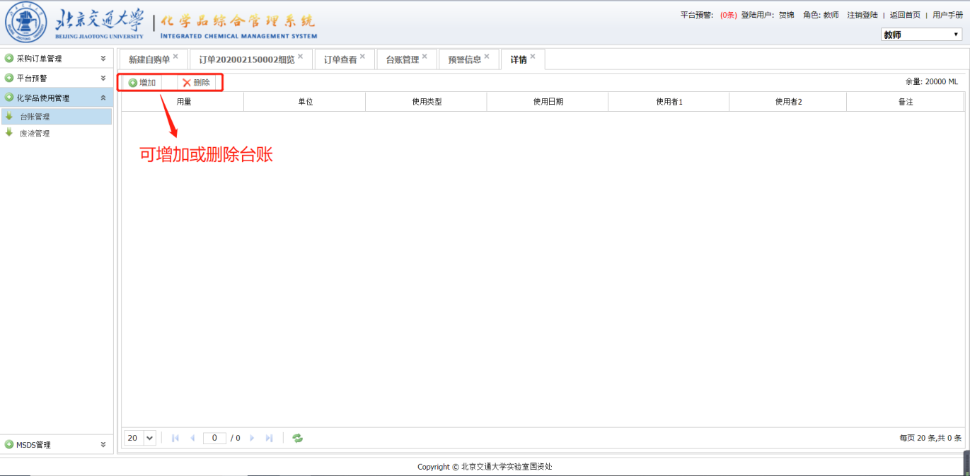 选中一条记录点击【删除】按钮,确认即可进行删除操作。点击【增加】按钮,输入要求的信息,然后点击【保存】即可录入一条台账。