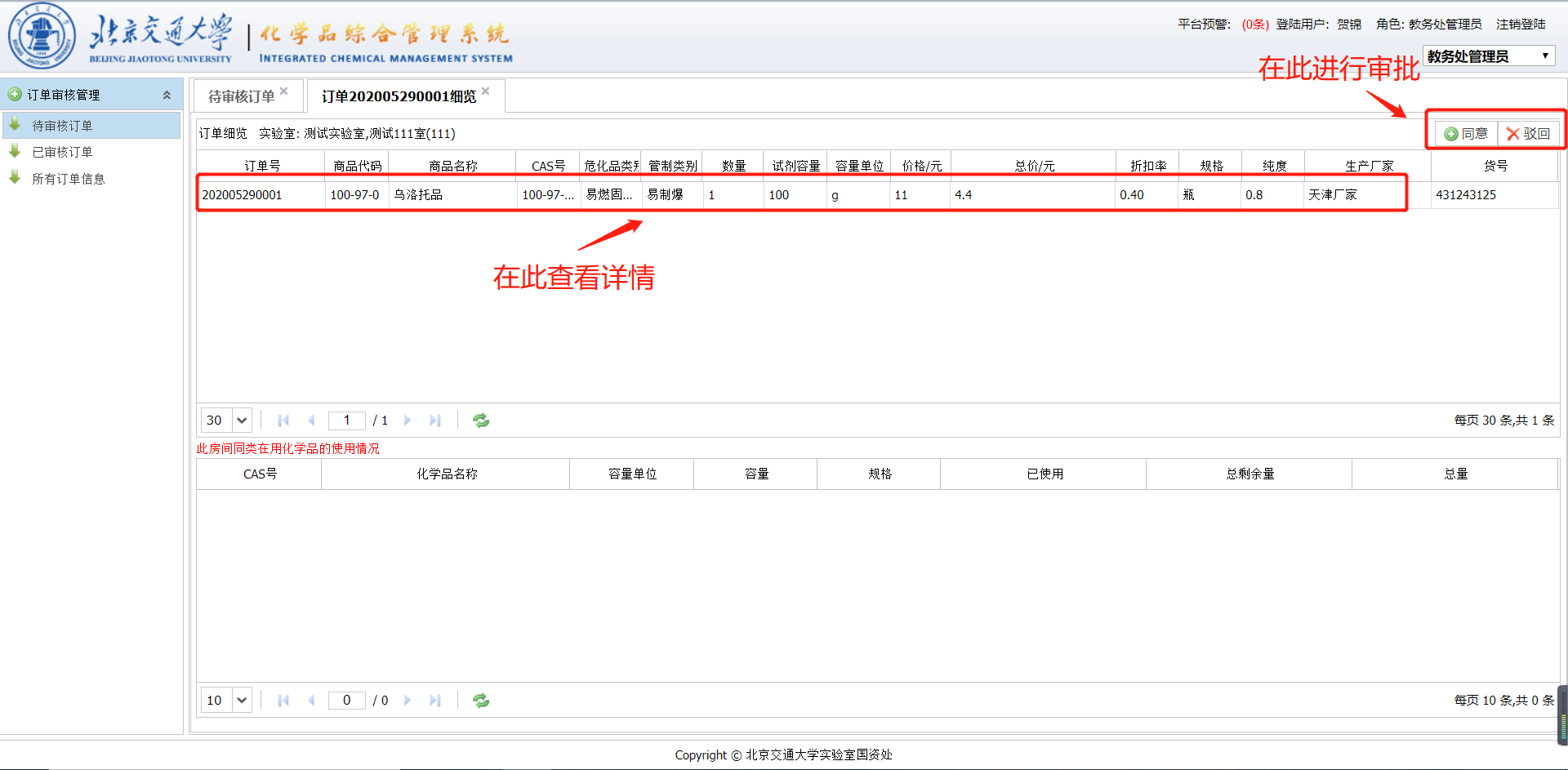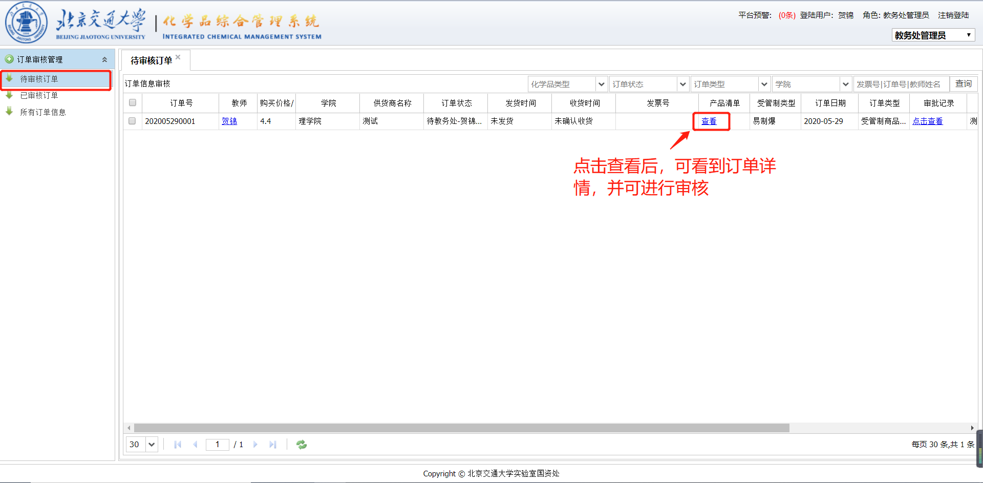 1)在待审核订单模块中,教务处及科技处管理员可以看到所负责范围内所有待审核的订单,并进行操作